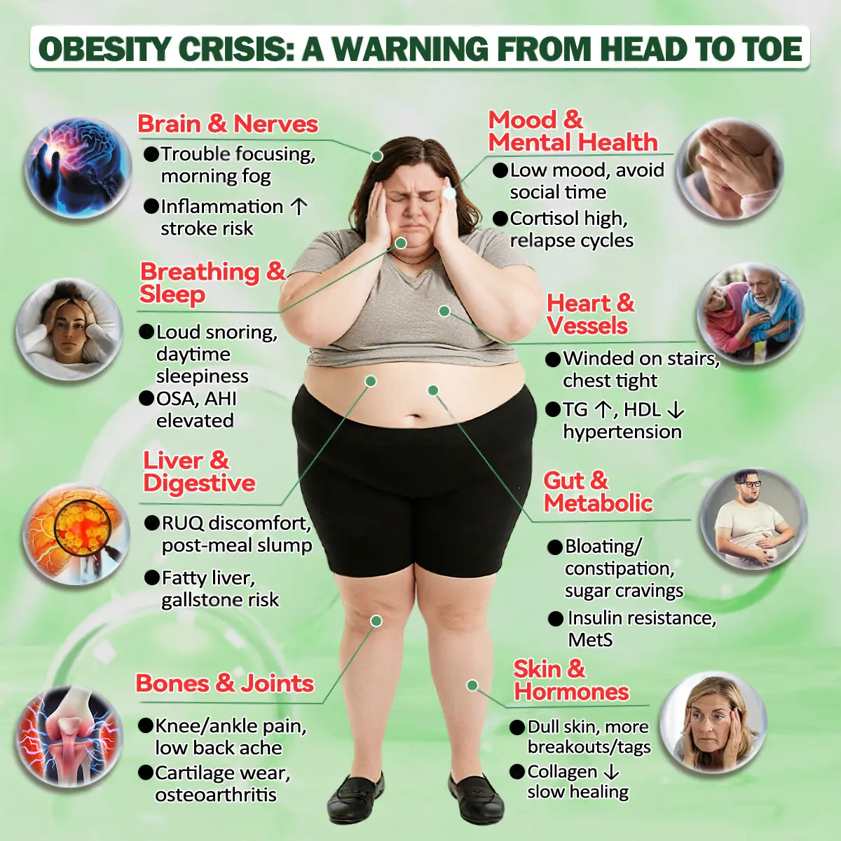- Sleep apnea:ย Causes breathing interruptions and fatigue while increasing the risk of high blood pressure and heart disease.