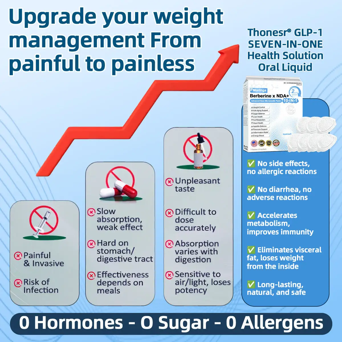 โ Easy Absorption: This formula uses an advanced nano microneedle patch delivery system. Combined with highly active ingredients such as berberine, it delivers key nutrients transdermally into the body, bypassing the digestive system and reducing gastrointestinal burden. The patch provides gentle, steady release for a more comfortable experience, making it especially suitable for individuals with sensitive digestion and those who prefer to avoid injectable weight-loss methods.