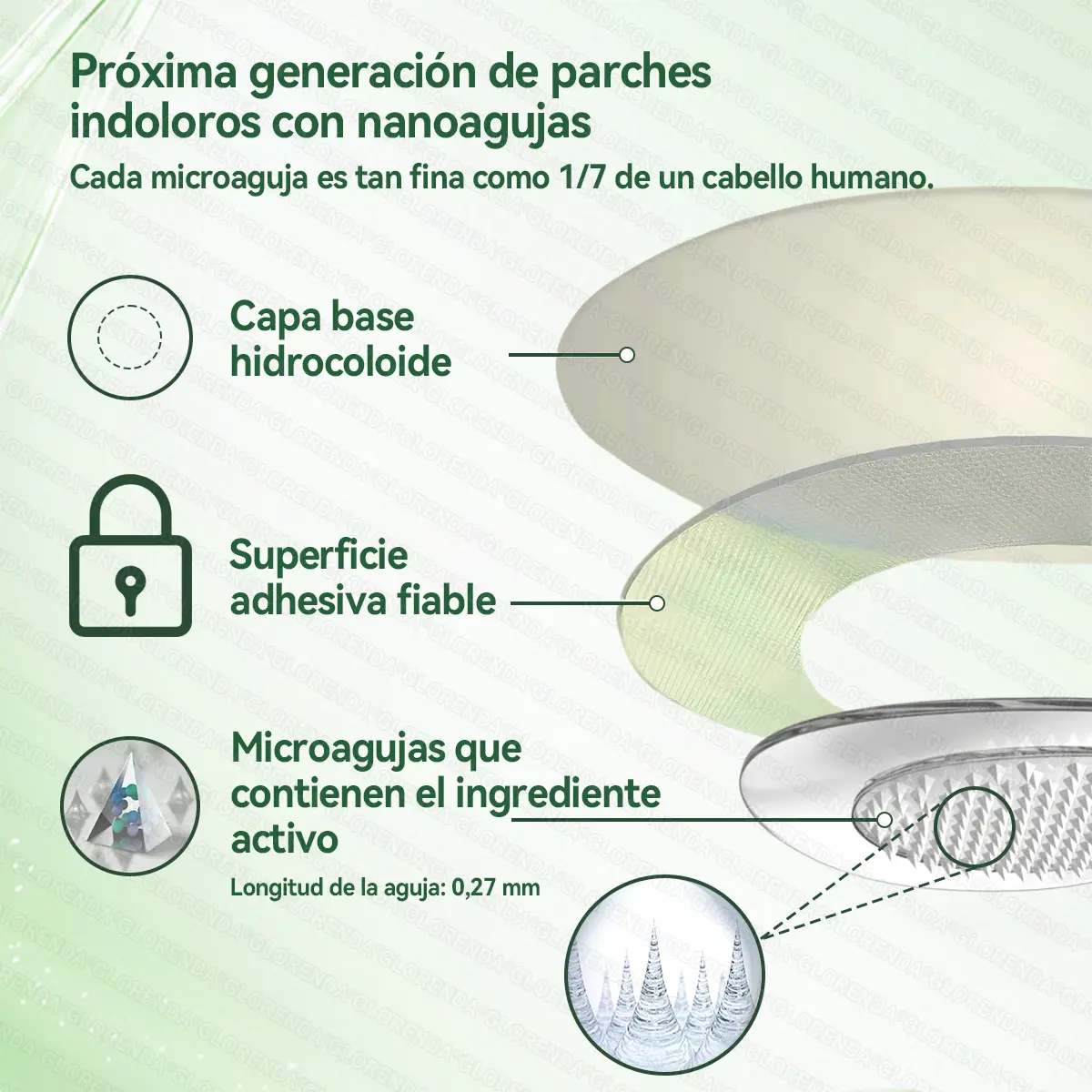GLOR๐ฌNDAยฎ utiliza Dissolving Micro-Dart Releaseโข: microagujas ultrafinas de solo 0,27 mm (aproximadamente 1/7 del grosor de un cabello humano) que se disuelven en las capas superficiales de la piel y liberan gradualmente los ingredientes activos para un apoyo constante.