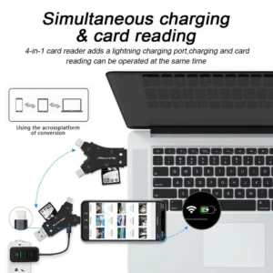 Access the data on your memory cards with this 4-in-1 Media Transfer with Memory Card. It’s suitable for all devices with 4 interfaces.The memory card reader is easy to use and practical to carry around. Simply insert your memory card into the Card Reader and plug it into your device.The card reader can be used with16G,32GB or 64GB Memory Card.