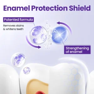 Patented formula strengthens tooth enamel while whitening, preventing future stains and sensitivity