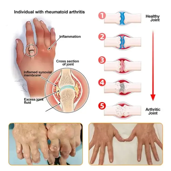 Rheumatoid Arthritis (RA) is a chronic inflammatory disease that causes inflammation and damage to the joints due to the autoimmune system attacking the synovial lining of the joints. Rheumatoid arthritis is characterized by joint pain, swelling, and stiffness, and usually occurs in small joints such as the fingers, wrists, knees, and ankles, but may affect other large joints as well.