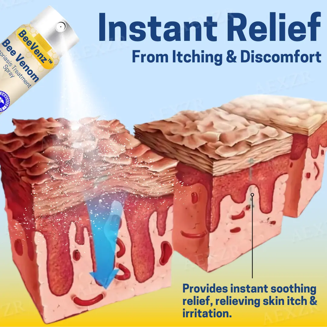 In addition to melittin, bee venom contains another essential component called apamin, which promotes skin regeneration and repair. Apamin supports the natural process of skin cell turnover, which can become disrupted in psoriasis, leading to excessive skin buildup. By encouraging balanced cell growth and reducing buildup, BeeVenz™ helps the skin restore its natural texture and appearance. The spray format of BeeVenz™ allows for easy, even application on affected areas, ensuring that the active ingredients are quickly absorbed without the mess of traditional creams or ointments. This fast-absorbing formula helps the skin feel smoother and more comfortable, providing users with relief from the persistent itching and flaking that often accompany psoriasis.