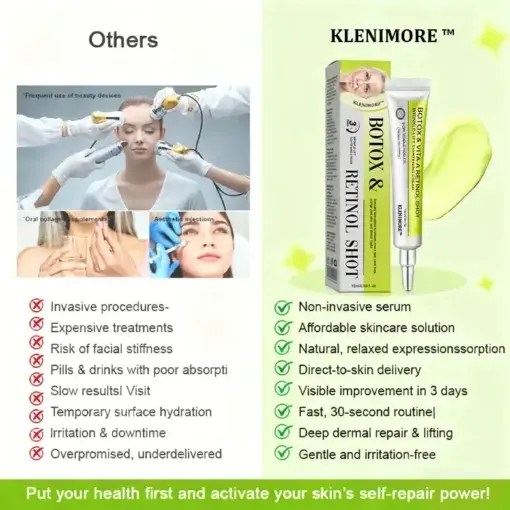 Top USA dermatologists consider KLENIMORE™ Botox & Vita-A Retinol a breakthrough in at-home anti-aging skincare. Clinically supported and recognized by leading dermatology associations, regular use has been shown to reduce wrinkles, improve skin firmness, and stimulate collagen production. Experts agree it’s a safe, non-invasive alternative to costly professional treatments, allowing anyone to enjoy professional-level anti-aging results at home.