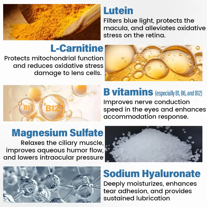 - Lutein (Myopia): Filters harmful blue light, protects the macula, and reduces oxidative stress on the retina.