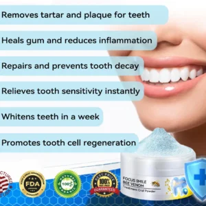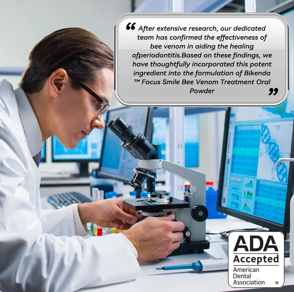 𝐁𝐢𝐤𝐞𝐧𝐝𝐚™ 𝐅𝐨𝐜𝐮𝐬 𝐒𝐦𝐢𝐥𝐞 𝐁𝐞𝐞 𝐕𝐞𝐧𝐨𝐦 𝐓𝐫𝐞𝐚𝐭𝐦𝐞𝐧𝐭 𝐎𝐫𝐚𝐥 𝐏𝐨𝐰𝐝𝐞𝐫 offers a revolutionary approach to achieving optimal oral hygiene. This advanced formula effectively removes 99.99% of harmful bacteria, freshens breath, removes plaque and tartar, treats gingivitis and periodontitis, relieves toothache, prevents cavities, restores enamel, stimulates dentin formation and supports natural tooth regeneration.