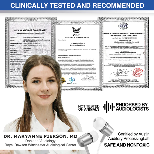 “LUHAKA™ Infrapeace is made to tackle tinnitus at its root. The laboratory tested Low Level Laser Therapy repairs damaged tissues in inner ear and stops the damaged tissues sending phantom signals to the brain. says Dr. Anastasia Sanford, Au.D., an audiologist at Royal Dawson Winchester Audiological Center in Massachusetts, one of the thousands of audiologists who considered InfraPeace to be one of the most effective over-the-counter solutions to soothe tinnitus.
