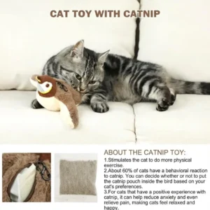 Give your feline friend hours of fun with our interactive bird! This toy emits realistic chirping sounds when touched, attracting your cat’s attention and stimulating their natural predatory instincts. Made of soft plush, it’s safe and irresistible for your kitty!