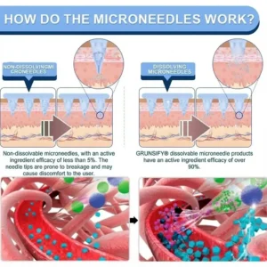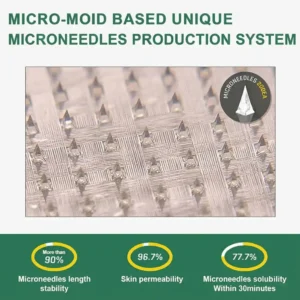Each needle is 0.27mm long. just 1/7th the thickness of a hair. and is made from dissolvable medication. These micro-needles are precision-engineered using cutting-edge manufacturing techniques to ensure a seamless. pain-free experience while effectively delivering the active ingredients directly into the skin.