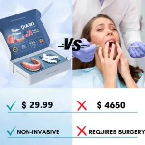 The QIAWI 2-Piece Denture Kit provides an exceptional alternative to traditional dental implants, offering convenience and affordability. Priced at just $29.99, this innovative solution allows you to restore your smile and improve chewing function without enduring the high costs and long treatment times associated with dental implants, which can run into tens of thousands of dollars. Choose QIAWI for a cost-effective, easy-to-use option that helps ou achieve a confident, beautiful smile—quickly and affordably.