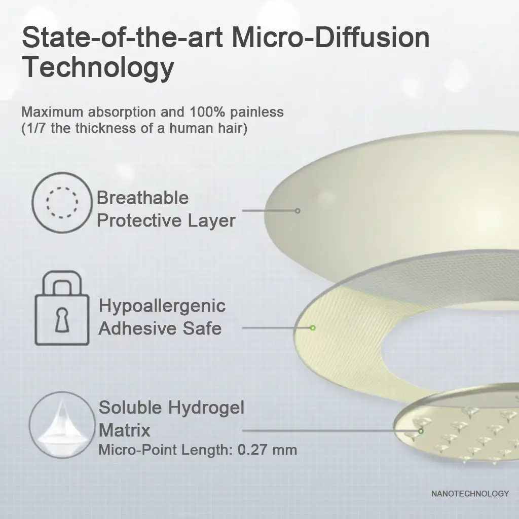 Precision-Engineered for Comfort and Efficacy “Each micro-point measures just 0.27 mm in length—merely 1/7th the thickness of a human hair—and is crafted from soluble active hydrogel. These points are precision-manufactured using state-of-the-art techniques to guarantee a 100% painless experience, while effectively delivering potent botanical ingredients directly into the skin for maximum absorption.”
